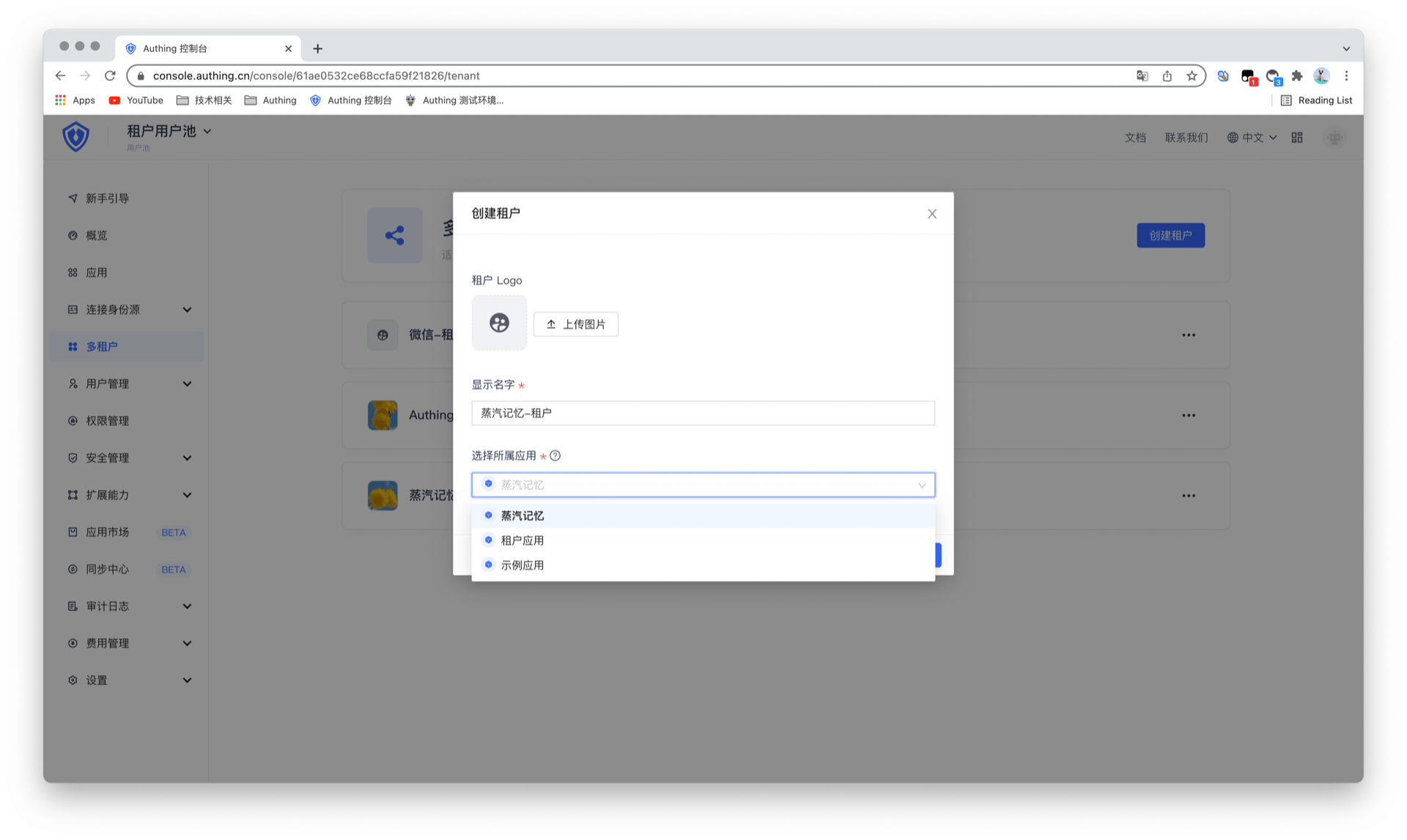 - 选择所属应用: 选择你要绑定该租户的应用,当前仅支持自建应用。