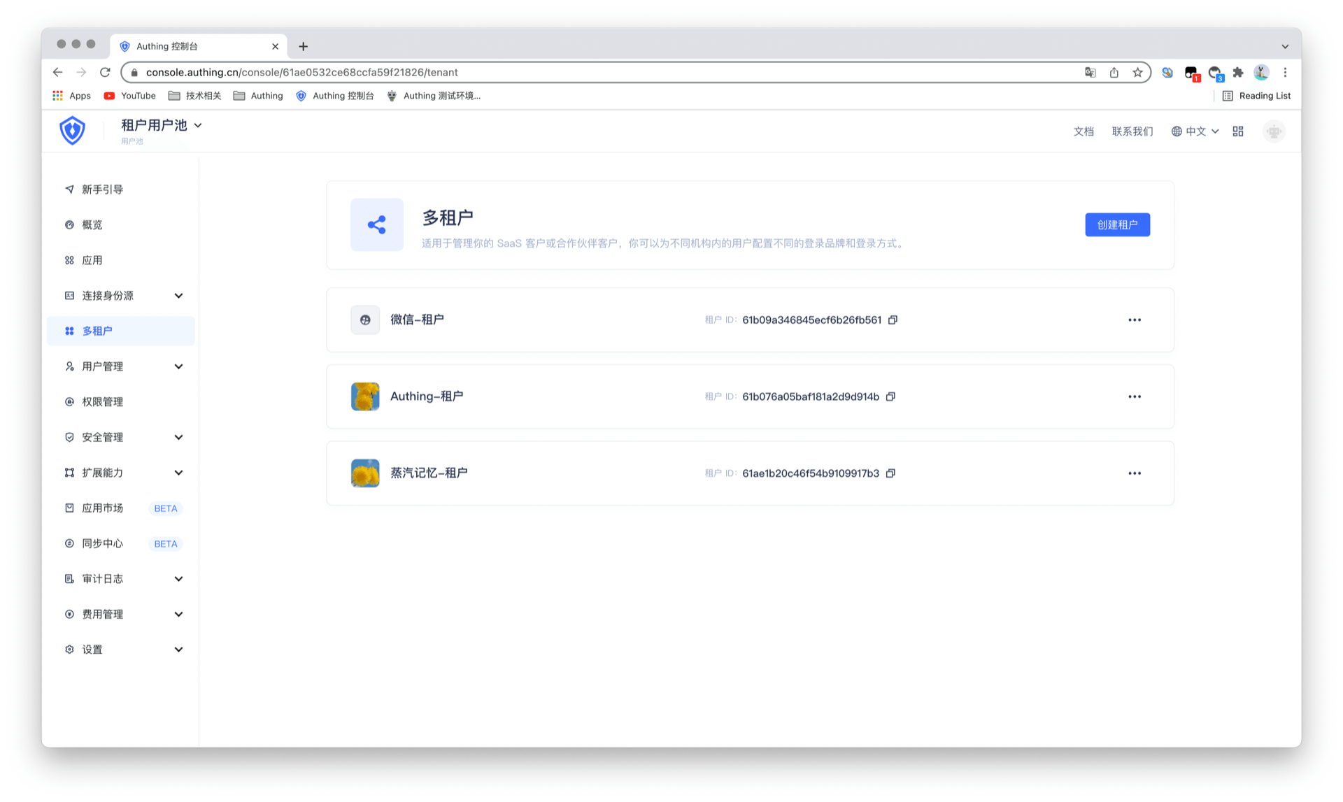 在控制台 (opens new window)点击多租户即可进入多租户管理页面 ,在这里你可以看到所有你已经创建的租户,并且可以创建新的租户。