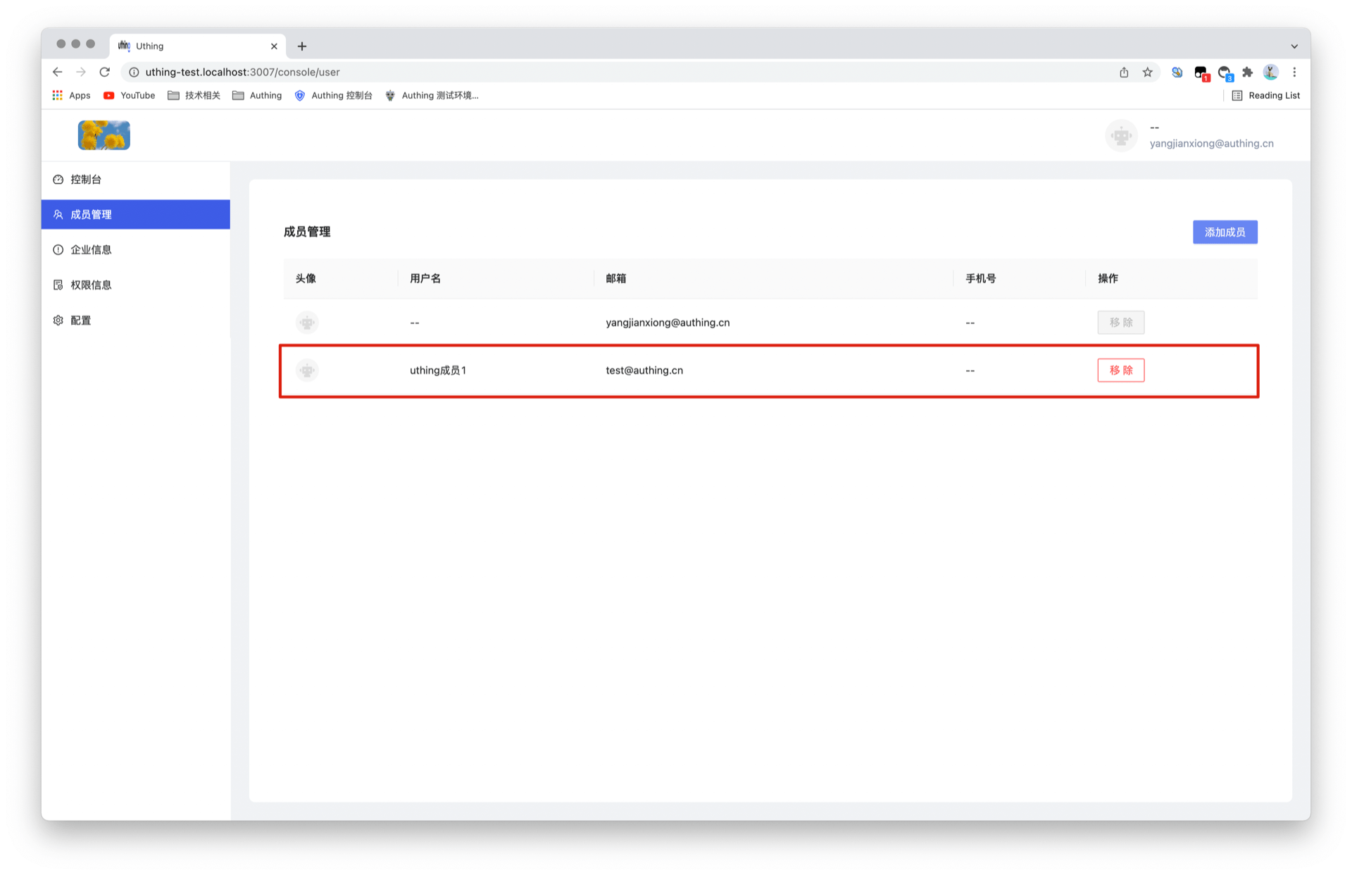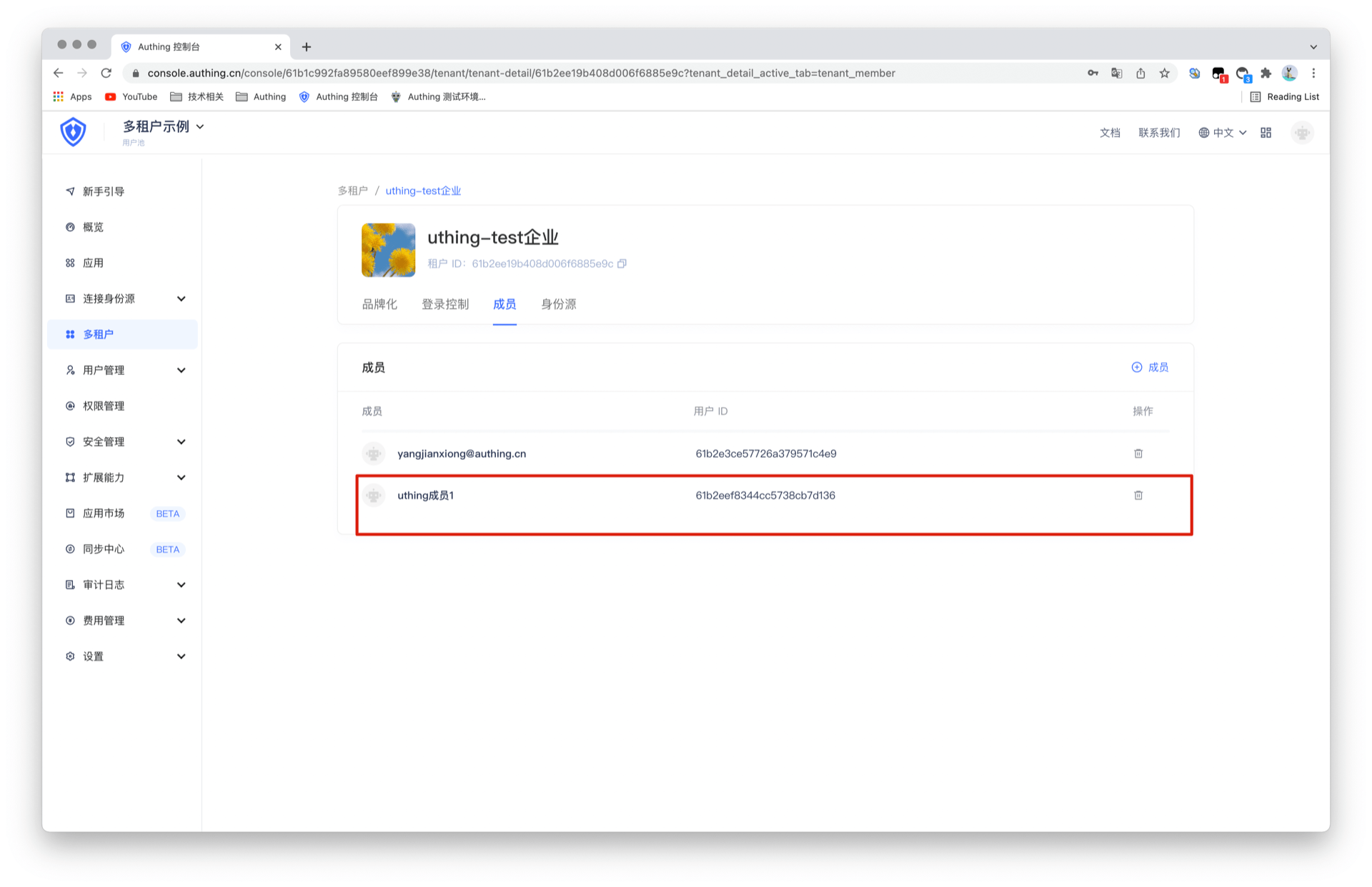 此时在 Uthing 成员列表和 Authing 租户成员列表中都可看到此用户。