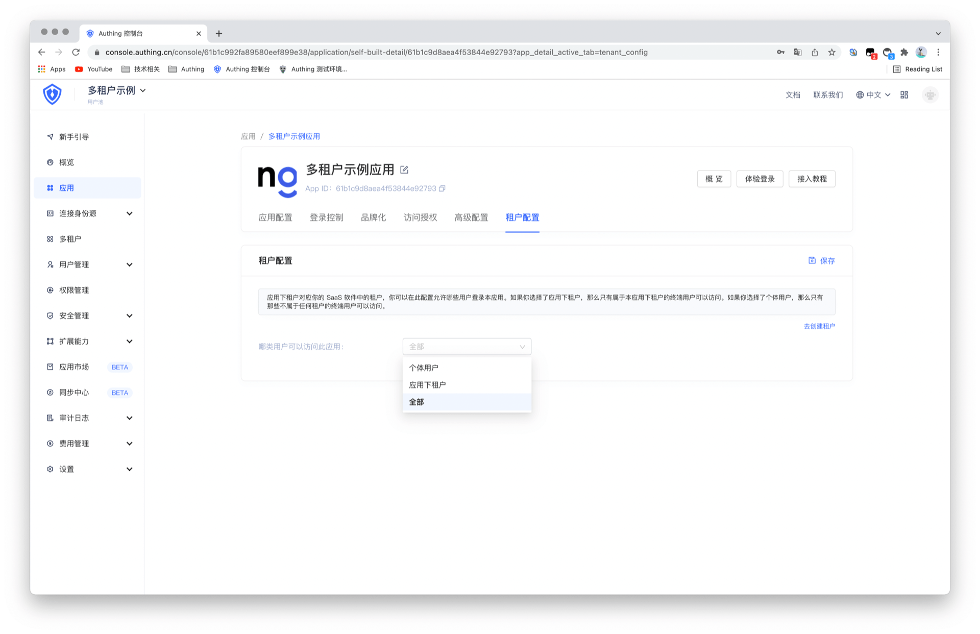client和server分别执行npm install安装依赖。然后到 Authing 控制台新建一个应用,在应用详情中找到 租户配置,在 哪类用户可以访问此应用 选择 全部。