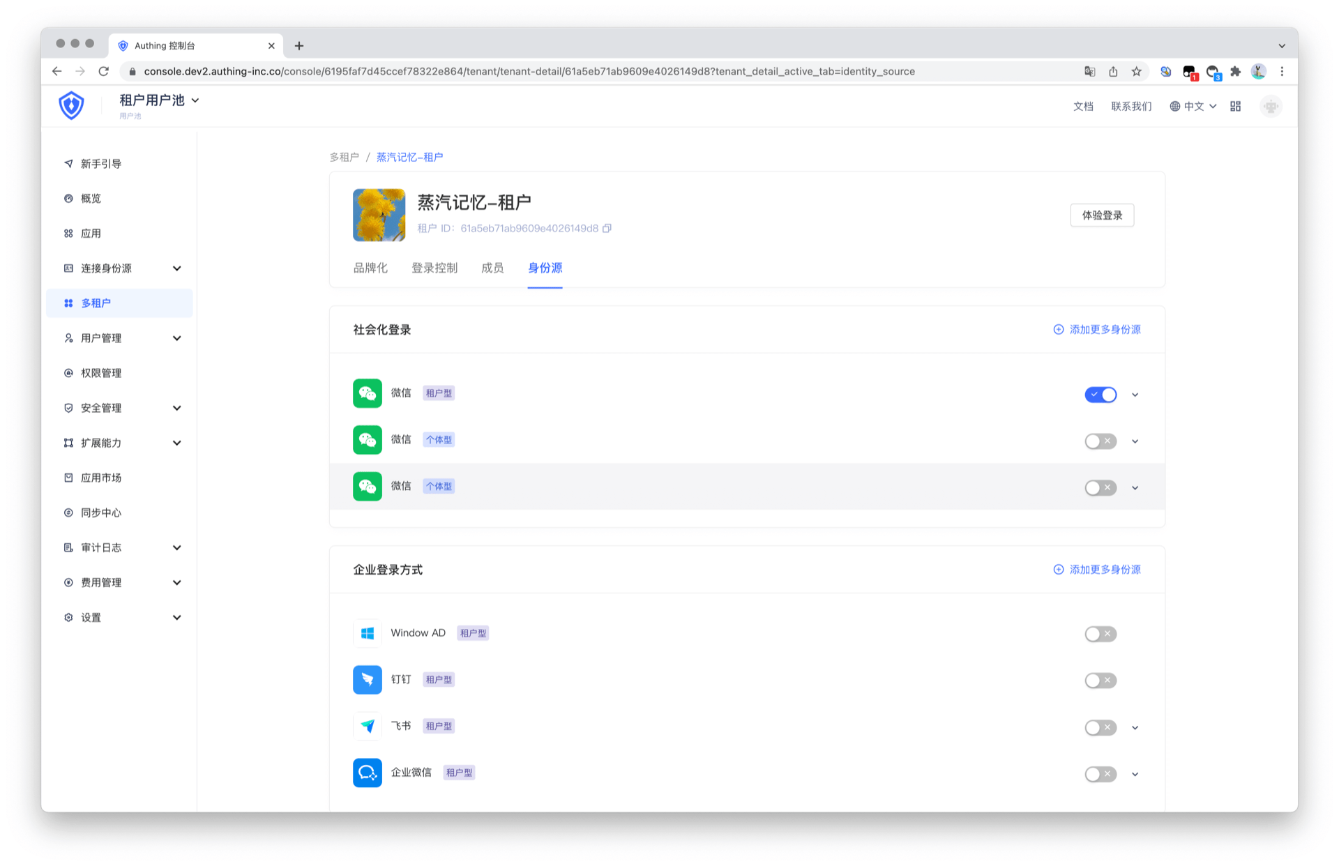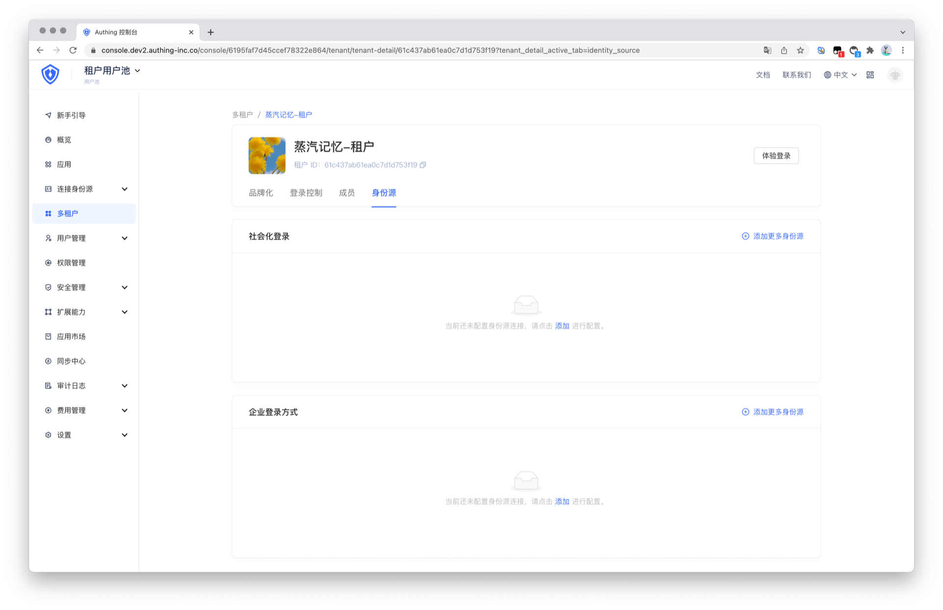租户可以使用社会化身份源进行登录,管理员可以点击添加更多身份源进行配置。
