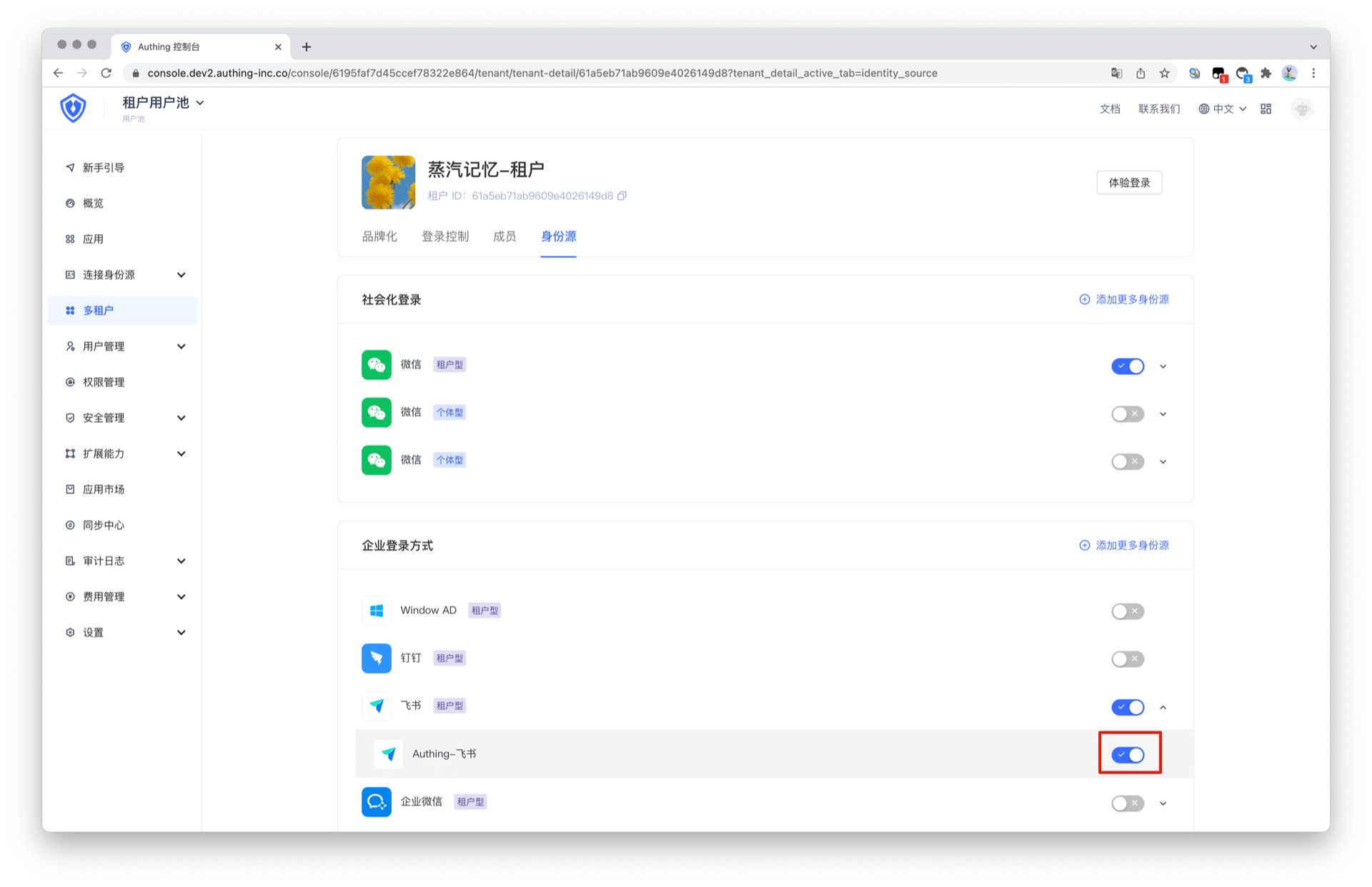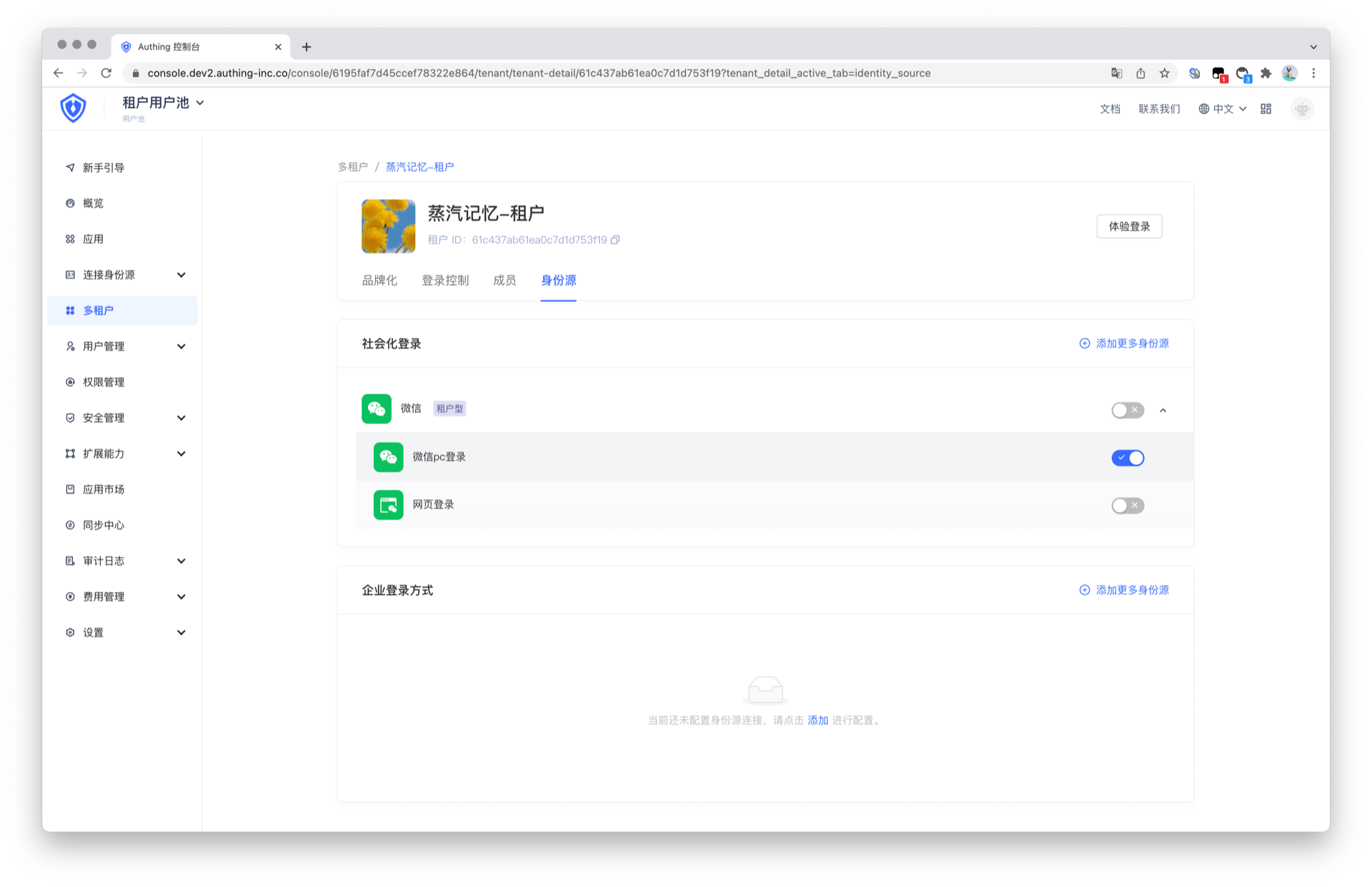 当前已支持添加第三方企业身份源作为租户的个性化登录方式。
