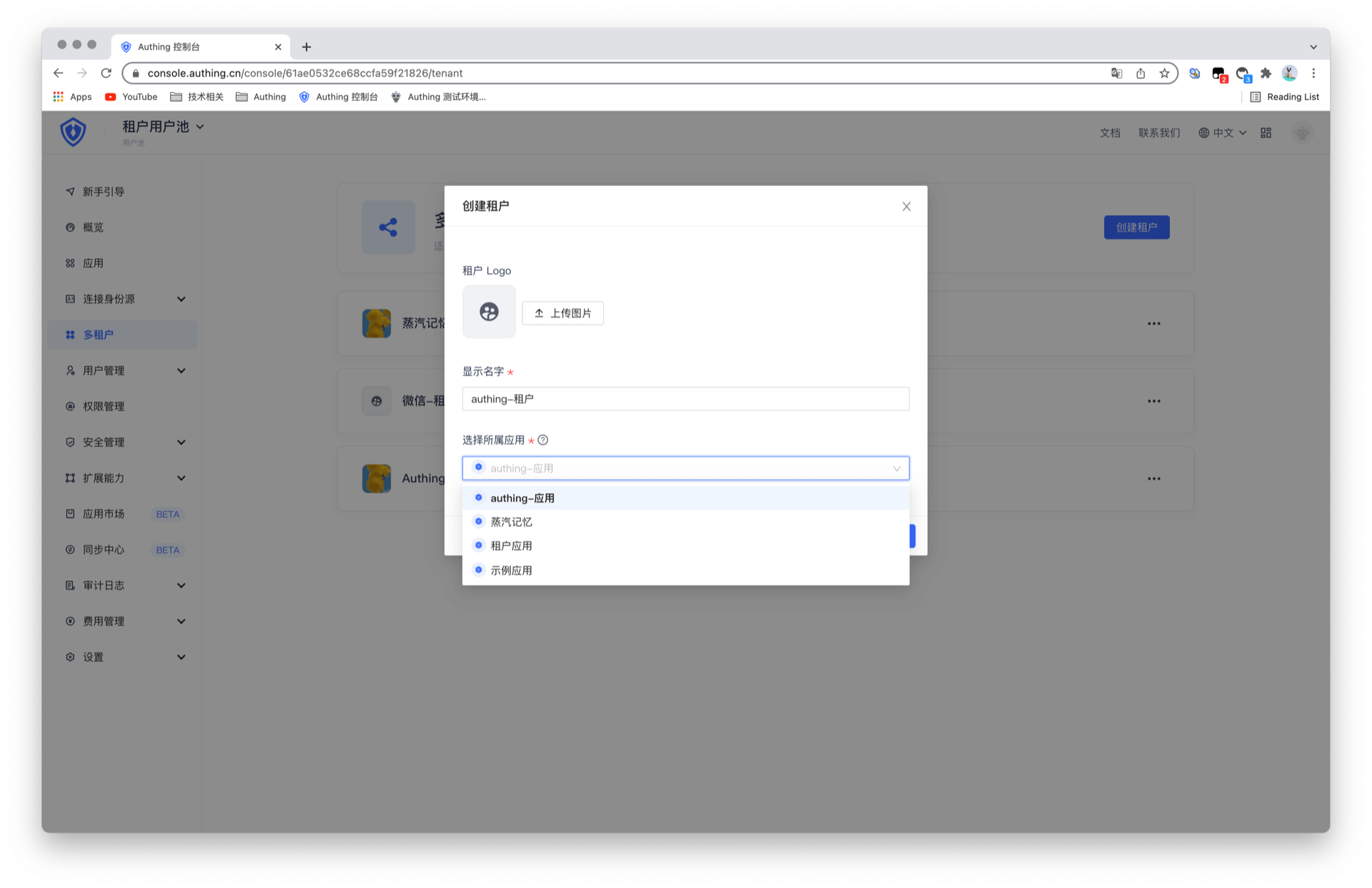 假如你还没有自建应用,请在 Authing 控制台上应用里点击添加应用,去创建一个自建应用。当前仅自建应用支持多租户功能。