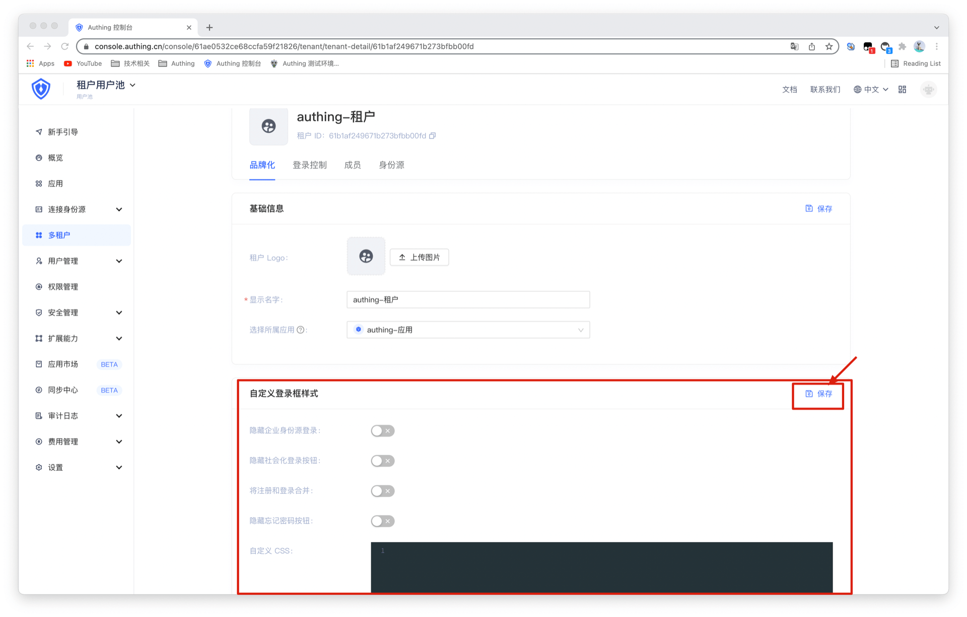 创建完租户后,点击品牌化,你可以通过自定义 CSS 改变登录页面样式,然后点击保存即可。当然也支持使用 Authing 默认提供的页面风格。