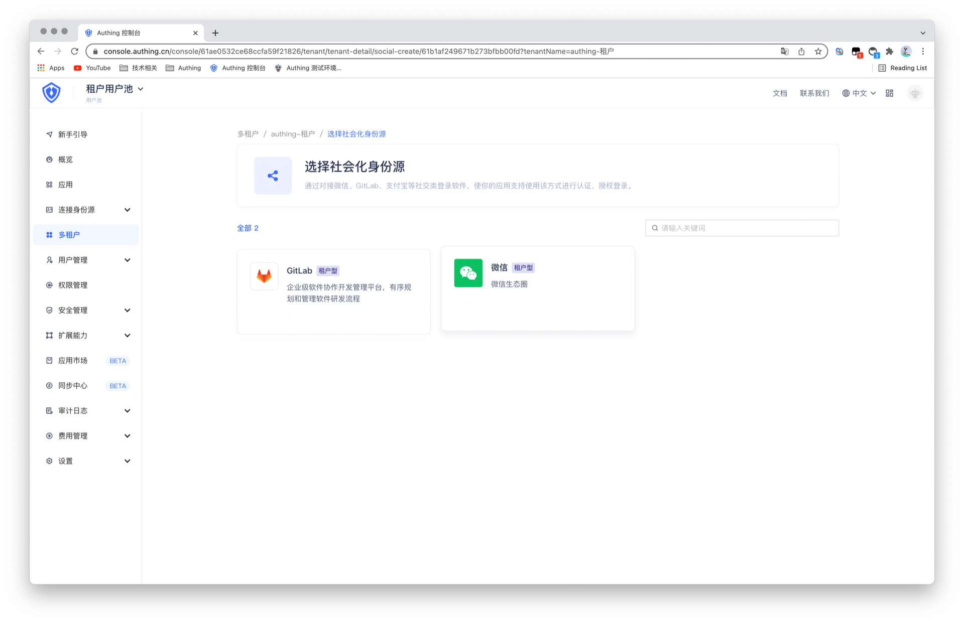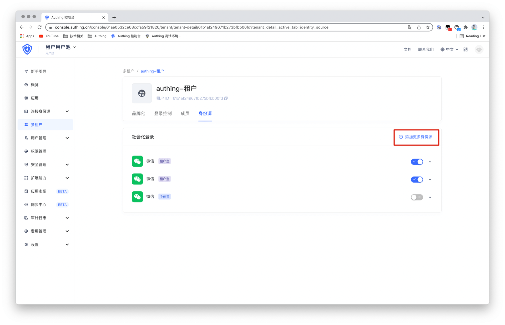你可以为租户添加更多第三方身份源,从而终端用户可以通过第三方身份源登录租户,目前支持的第三方身份源有 GitLab 和微信生态。