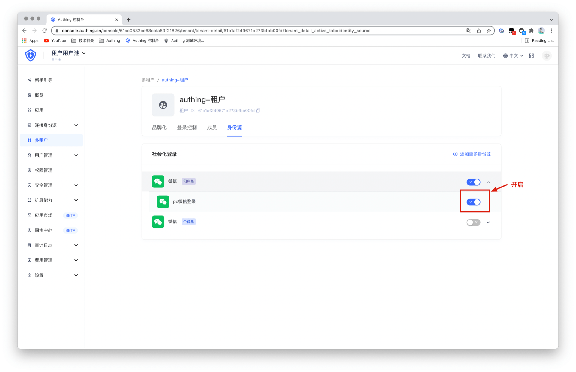 创建完身份源后,通过右侧开关按钮控制该租户是否支持该身份源作为登录方式。