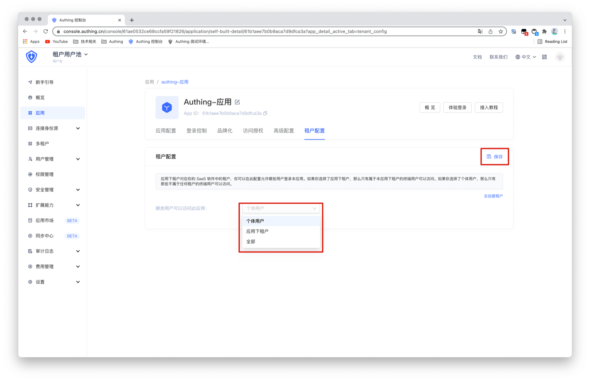 以上配置都完成后,在应用中选择租户配置菜单,可以选择哪些用户可以访问该应用。