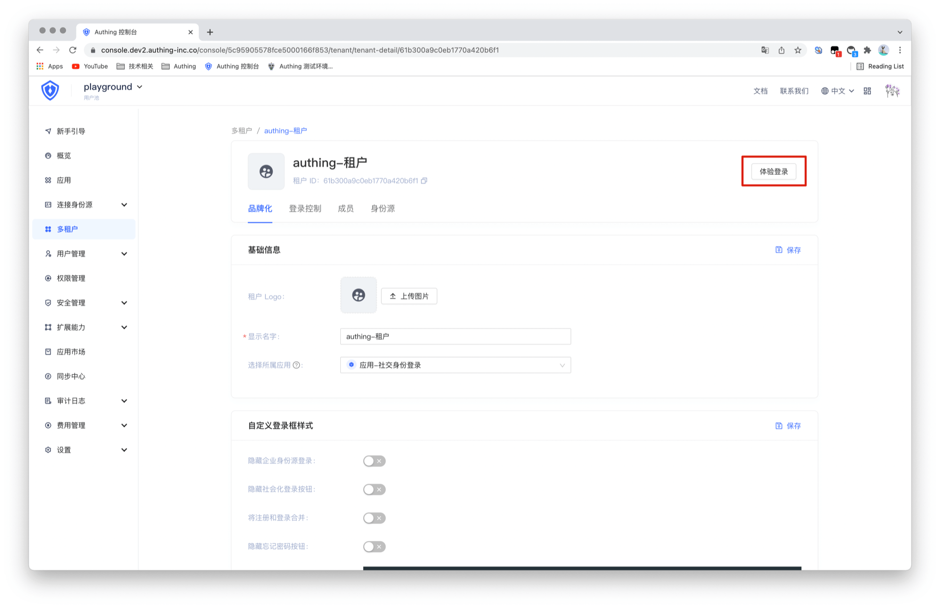 进入已创建的租户内,点击体验登录按钮,即可快速体验登录效果。