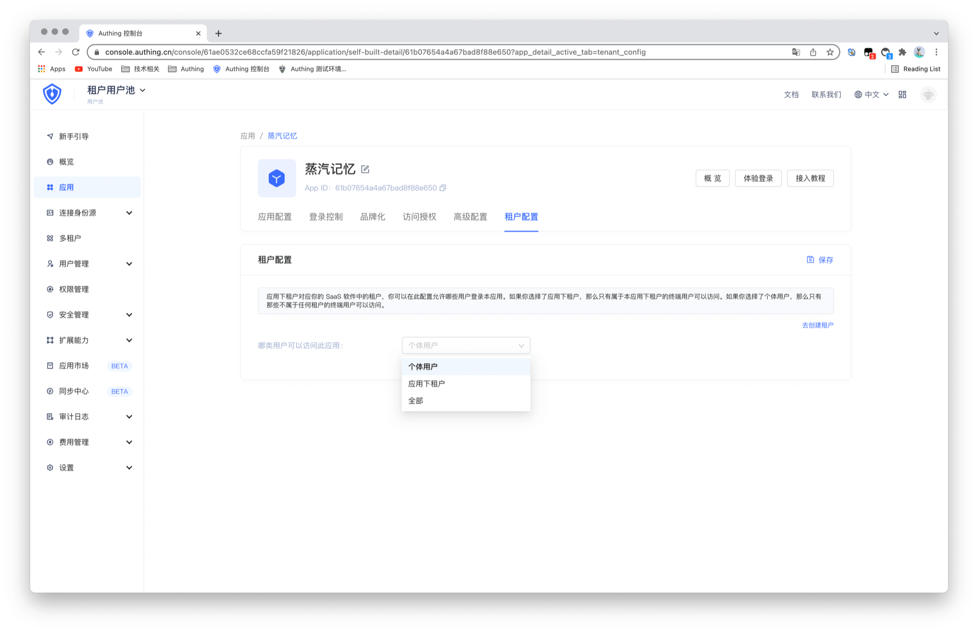 应用下租户:仅该应用所关联的租户下的成员可登录,具体可通过租户成员配置。