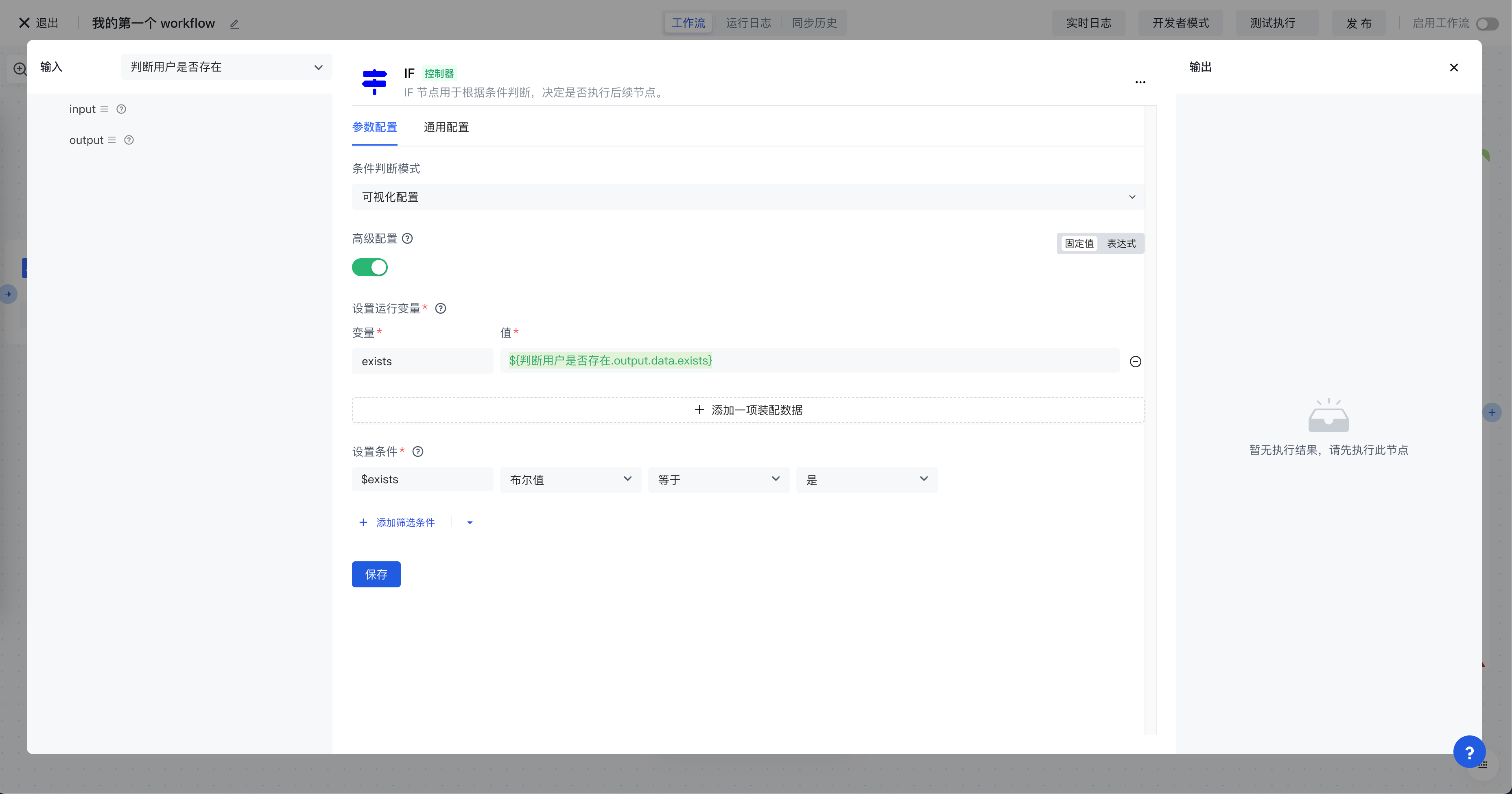 此节点的配置如下:首先我们定义一个变量,叫做 exists,值取的是上一节点「判断用户是否存在」执行结果 ${判断用户是否存在.output.data.exists},然后我们在条件中设置当 exists 的值(通过 $exists 引用,这个值是一个布尔类型)为「是」: