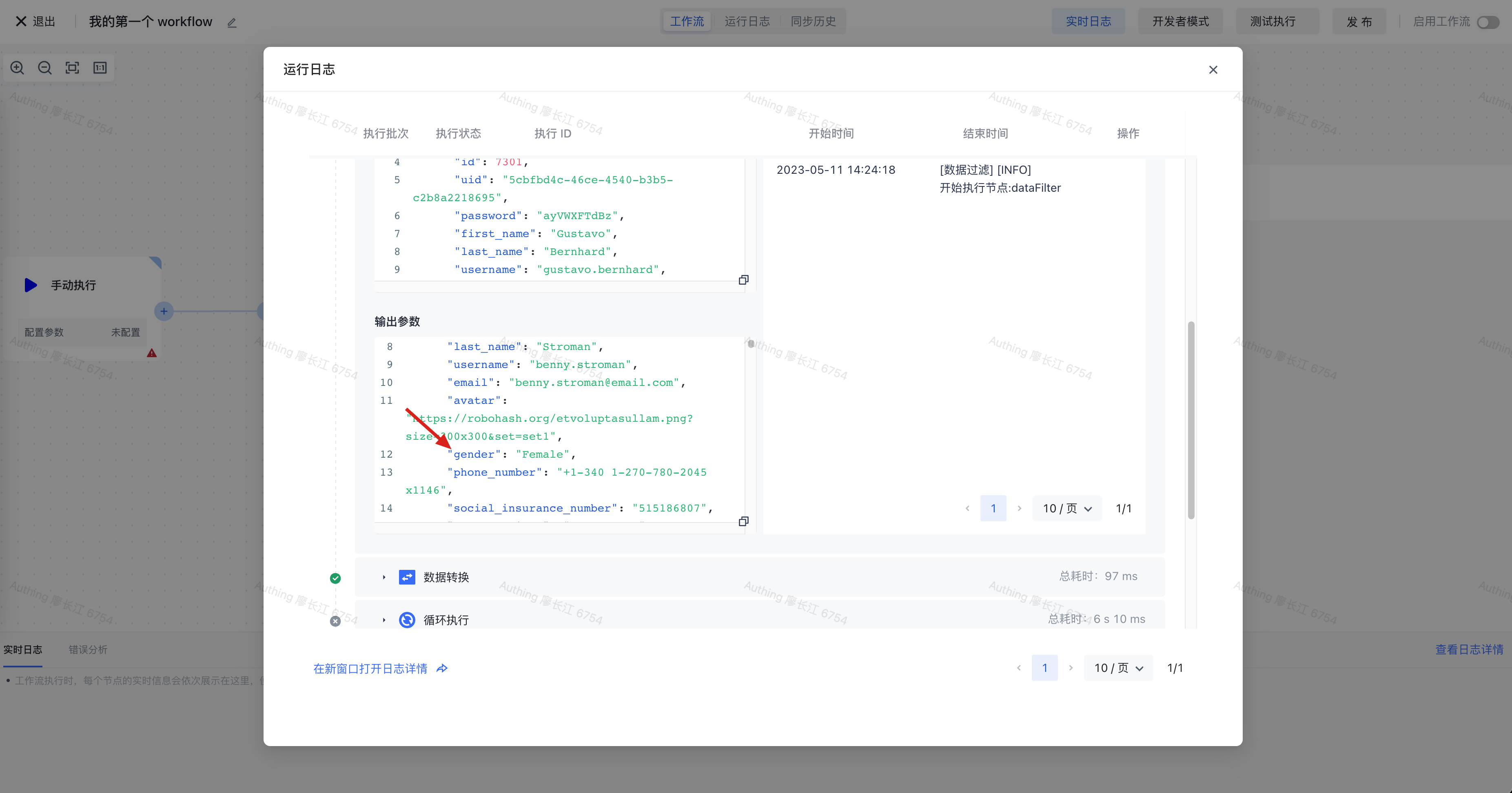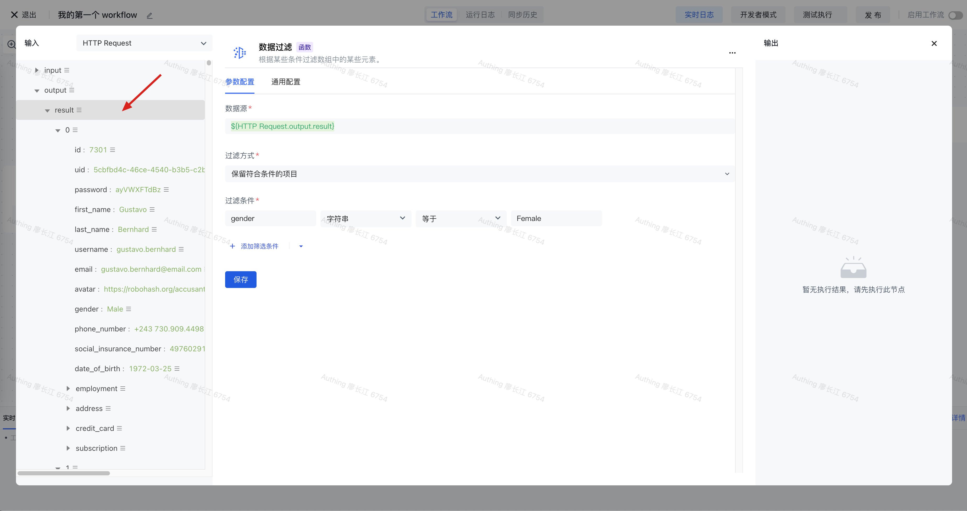 接着点击数据过滤节点的「执行」按钮,等执行完成之后,可以看到此节点的输出结果: