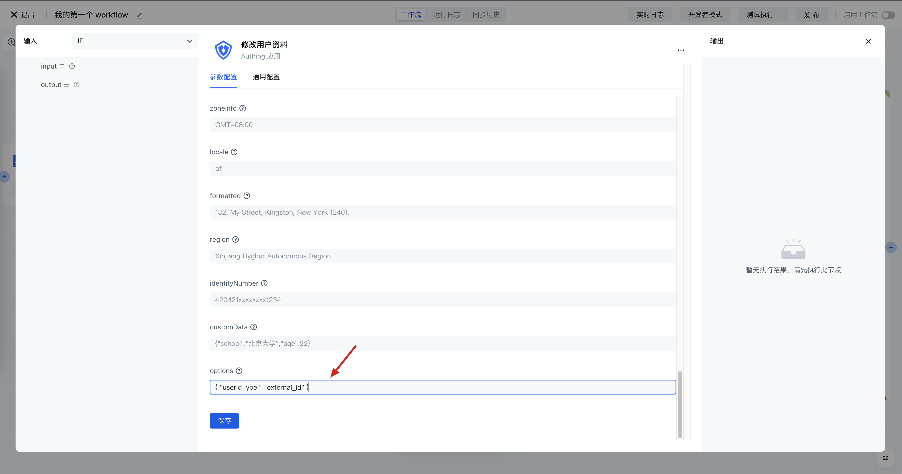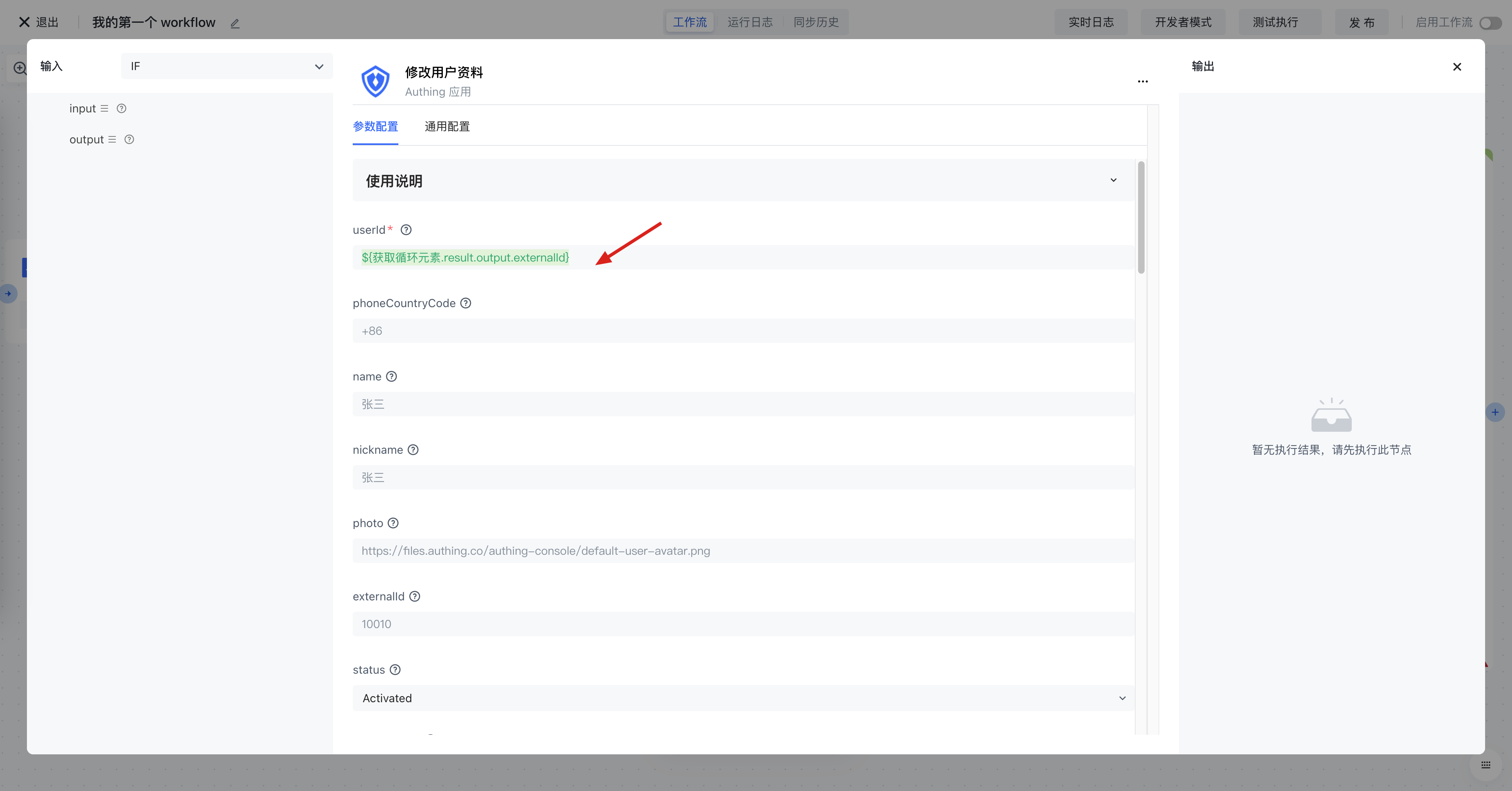 同时,在循环节点传入的列表是第三方的用户数据,不是 Authing 的用户,所以在更新用户资料的时候,无法获取 Authing 的用户 ID。好在我们的 V3 的更新用户资料 API 支持传入一个可选字段 —— userIdType,我们可以根据 externalId 字段来更新用户: