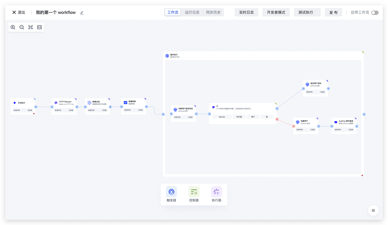 最后来 Review 一下我们创建的这个流程:首先通过 HTTP 节点拉取数据,经过数据过滤节点过滤出我们实际想要的数据,然后通过数据转换节点将用户信息转换成 Authing 标准格式,最后将此转换过后的列表传入循环节点,在循环体中,针对每一条数据,先调用 Authing 节点中的判断用户是否存在方法,然后添加 IF 节点使用判断用户是否存在节点的结果作为判断依据,最后分别执行创建用户或者更新用户资料的流程。