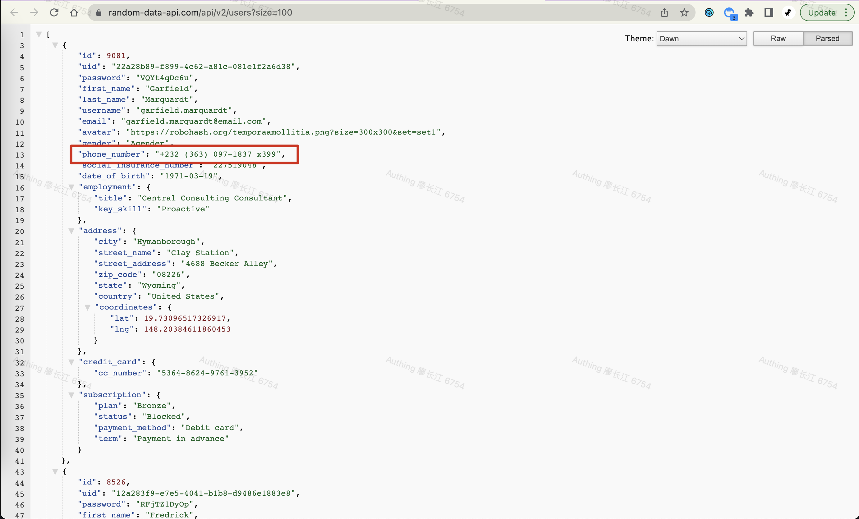 这里我们使用 https://random-data-api.com/ (opens new window) 提供的免费服务 mock 数据,将用到 https://random-data-api.com/api/v2/users?size=100 (opens new window) 这个接口生成随机数据。